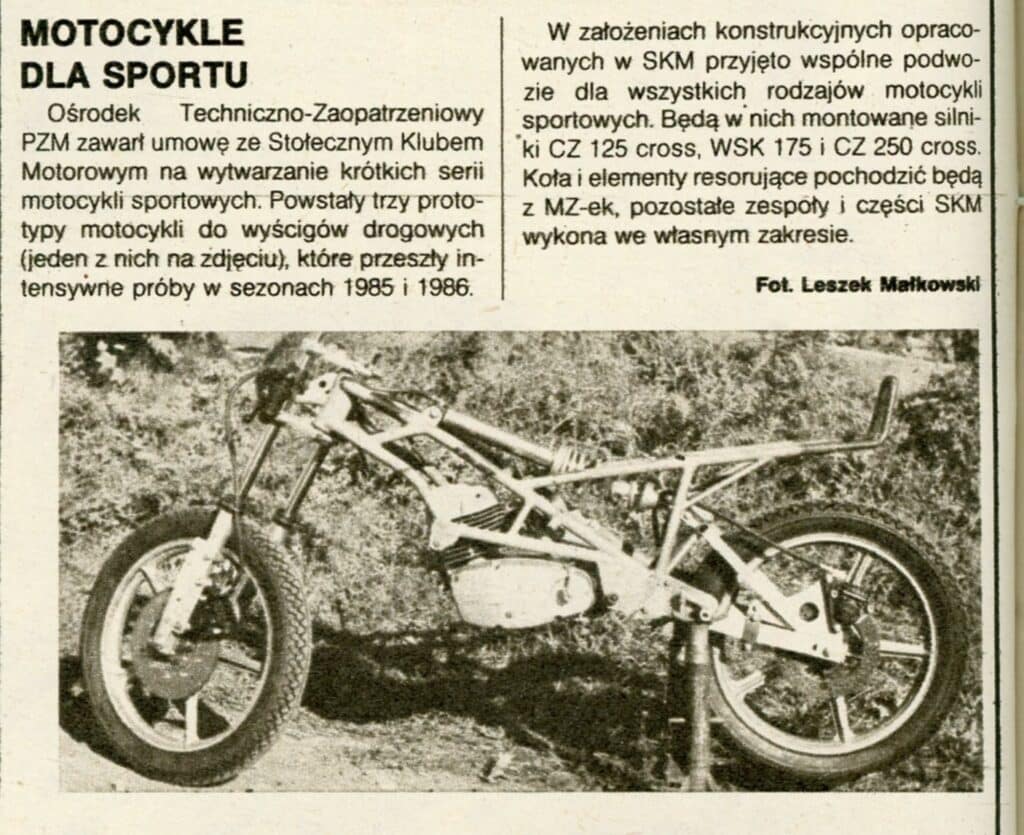 Włodzimierz Gąsiorek niemal od początku działalności SKM, a był wtedy prezesem klubu, sugerował wykonanie serii własnych motocykli sportowych. Już latach 1985-86 rozpoczęły się rozmowy z PZM w sprawie utrzymania sportu motocyklowego na możliwym do realizacji poziomie poprzez produkcję własnego sprzętu. Niestety, nie mogły się tego podjąć biura konstrukcyjne polskich fabryk motocyklowych, bo… już ich nie było. Ostatnią zlikwidowaną fabryką była WSK w Świdniku, która przestała istnieć w październiku 1985. Nie całkowicie, bo śmigłowce stały się teraz jej głównym produktem. SKM zdążył odkupić z masy likwidacyjnej urządzenie do spawania ram motocyklowych, które wkrótce się przydało.